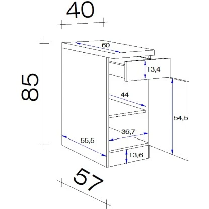 Der 40 cm breite Unterschrank weiß durch eine hochwertige Verarbeitung sowie Materialauswahl zu gefallen und garantiert Ihnen auch auf kleinen Flächen ein Höchstmaß an Stauraum. Dabei verfügt der kompakte Unterschrank neben einer Drehtür auch über einen Schubkasten und einen Einlegeboden.