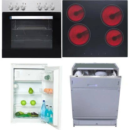 Werten Sie Ihre Küchenleerzeile mit dem effizienten Elektrogeräte-Set auf und sparen Sie hierbei bares Geld. Im Kühlschrank, der einen Nutzinhalt von 104 Litern vorweist, können Sie reichlich Lebensmittel verstauen, verteilt auf zwei Fächern und einem Obst- und Gemüsebehälter. In der Tür befinden sich drei Ablagen zum Lagern von Getränken und weiteren Naturalien. Das 4-Sterne-Gefrierfach eignet sich mit 17 Litern Nutzinhalt nicht nur zum langfristigen Lagern Ihrer Nahrungsmittel, sondern auch zum Einfrieren. Auf dem energieeffizienten Einbauherd mit Edelstahlblende und dem elegantem 4-Zonen-Glaskeramikkochfeld lassen sich schnell köstliche Mahlzeiten zubereiten. Der vollintegrierte Einbaugeschirrspüler punktet mit seinem geringen Energie- und Wasserverbrauch. Aber auch die einfache Bedienung und der großzügige Innenraum machen diesen Geschirrspüler zu einem unersetzlichen Assistenten in Ihrer Küche.