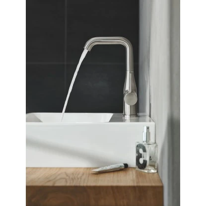 Die wassersparende Grohe Essence Einhand-Waschtischarmatur verfügt über einen hohen Auslauf und eine Zugstangen-Ablaufgarnitur in der Farbvariante Supersteel.