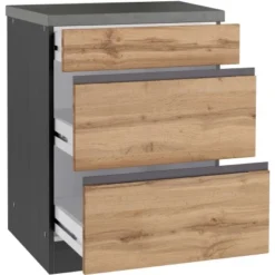 Mit dem Küchenunterschrank Turin von Held Möbel mit hochwertigen MDF-Fronten können Sie ihre Küchenzeile perfekt ergänzen. Zwei Auszüge sowie ein kleiner Schubkasten bieten genug Stauraum für Besteck, Töpfe und andere Küchenutensilien. Optisch begeistert der Unterschrank durch die klaren Linien sowie die zweifarbige Gestaltung. Da der Schrank in zwei Farbkombinationen verfügbar ist, können Sie die Küche im Mix-and-Match Stil einrichten. Eine 28 mm starke Arbeitsplatte in Beton-Optik ist inklusive.