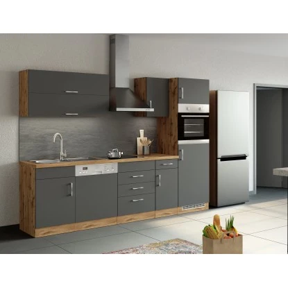 Die Küchenzeile wird Ihnen zerlegt und ohne Dekoration geliefert. Die Anordnung der Küchenelemente und die Anschläge der Türen sind somit für Sie frei wählbar. Die Arbeitsplatte wird ohne Ausschnitte geliefert. Technische Änderungen und Irrtümer vorbehalten