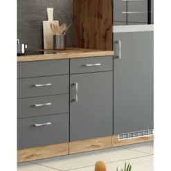 Die Küchenzeile wird Ihnen zerlegt und ohne Dekoration geliefert. Die Anordnung der Küchenelemente und die Anschläge der Türen sind somit für Sie frei wählbar. Die Arbeitsplatte wird ohne Ausschnitte geliefert. Technische Änderungen und Irrtümer vorbehalten