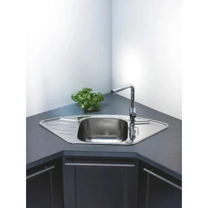 Die OBI Eckeinbauspüle Canto Basic 92 mit Ablauf ist eine Eckeinbauspüle in moderner Form inkl. Abtropffläche. Die Edelstahlspüle besticht durch modernes Design und hochwertige Verarbeitung. Sie eignet sich für Unterschränke ab 50 cm und Eckschränke ab 90 cm.