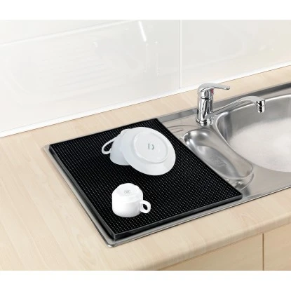 Die extra große Abtropfmatte Maxi verhindert lästige Kratzer auf der Spüle und dem Geschirr. Zudem vergrößert die praktische Geschirrablage aus dem Gastronomie-Bereich die Spülfläche. Die robuste Abtropfmatte sorgt mit über 2.700 Noppen für einen sicheren Halt aller hochwertigen Gläser, Tassen und Teller. Durch die Noppenstruktur kann das überschüssige Spülwasser problemlos ablaufen und das Geschirr trocknet schneller. Diese clevere Trocken-Matte eignet sich auch ideal zum aufrechten Abtropfen von Schneidebrettern.