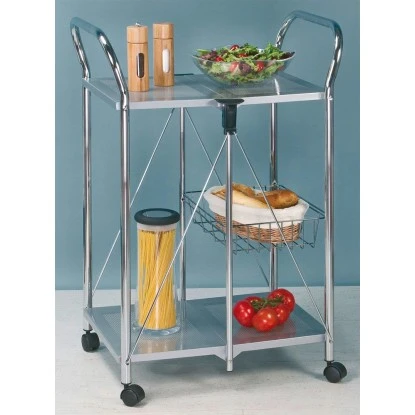 Das robuste Chrom-Metallgestell sorgt dabei für Stabilität. Die Belastbarkeit beträgt bis zu 40 kg. Der Wagen kann mit einem Handgriff zusammengeklappt und damit sehr platzsparend verstaut werden.