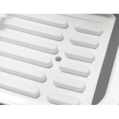 Der Abtropfer besteht aus flexiblem Silikon und bietet mit seiner großen Ablagefläche viel Platz für Geschirr, Besteck oder sonstigen Küchenutensilien. Darüber hinaus ist er rutsch- und kratzfest und verfügt über genug Stellplatz für Teller und Tassen und hat eine separate Vorrichtung für Besteck. Der ausziehbare Ablauf vereinfacht das Abgießen von Wasser und erleichtert die Reinigung. Dabei bleibt die Arbeitsplatte stets trocken.