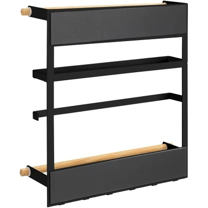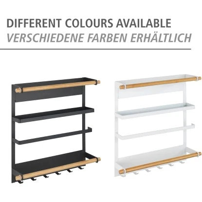 Gefertigt sind die Stäbe des Regals aus hochwertigem Bambus, welcher hart und widerstandsfähig ist. Auch unter ökologischen Aspekten bietet das Material klare Vorteile: Bambus ist ein schnell nachwachsender Rohstoff und liegt dank seiner Natürlichkeit absolut im Trend. Silikonringe an den jeweiligen Enden der beiden Stäbe verhindern ein ungewolltes, seitliches Verrutschen. In Kombination mit der Regalkonstruktion aus hochwertigem, pulverbeschichteten Metall in Schwarz verleiht das Möbelstück Ihrer Küche unverzüglich ein warmes und natürliches Ambiente. Befestigen lässt sich das Gestell schnell und einfach mit zwei an der Rückseite befindlichen, breiten Magneten. Alternativ eignet sich auch doppelseitiges Klebeband zur Anbringung ohne Bohren. Dies ist im Lieferumfang enthalten.
