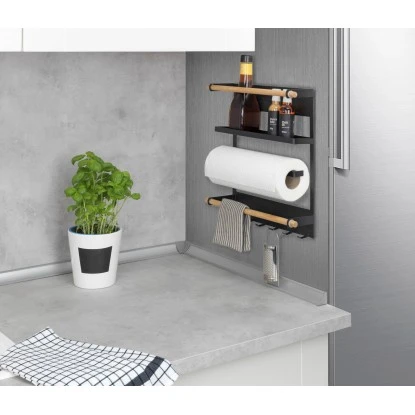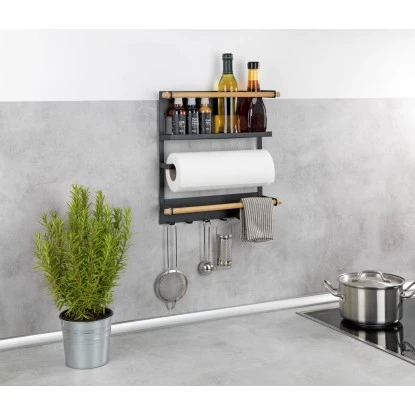 Das magnetische Wenko Küchenregal Magna Schwarz sorgt für Ordnung in jeglicher Hinsicht. Ohne zu Bohren befestigt, bietet die praktische Ablage die Möglichkeit der Aufhängung von Küchenhandtüchern und Küchenutensilien, geschickte Stellfläche für Gewürze und Öle sowie eine komfortable Rollenhalterung für Küchenpapier.